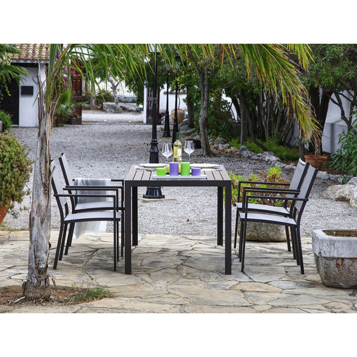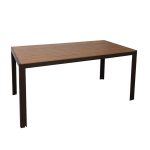 Mesa de estructura de aluminio color chocolate con superficie de lamas en aluminio imitación madera, material de gran resistencia en exteriores. Puedes combinar un diseño elegante junto con las sillas de esta misma serie, para poder difrutar de tus ratos de ocio y descanso en tu jardín, terraza o patio. Ya nos puedes solicitar las sillas en nuestra página web. La mesa tiene unas dimensiones de 160×84 cm y una altura de 75 cm. Se presenta en caja desmontada.