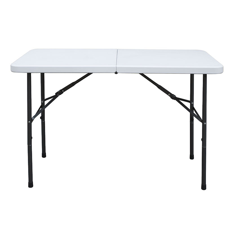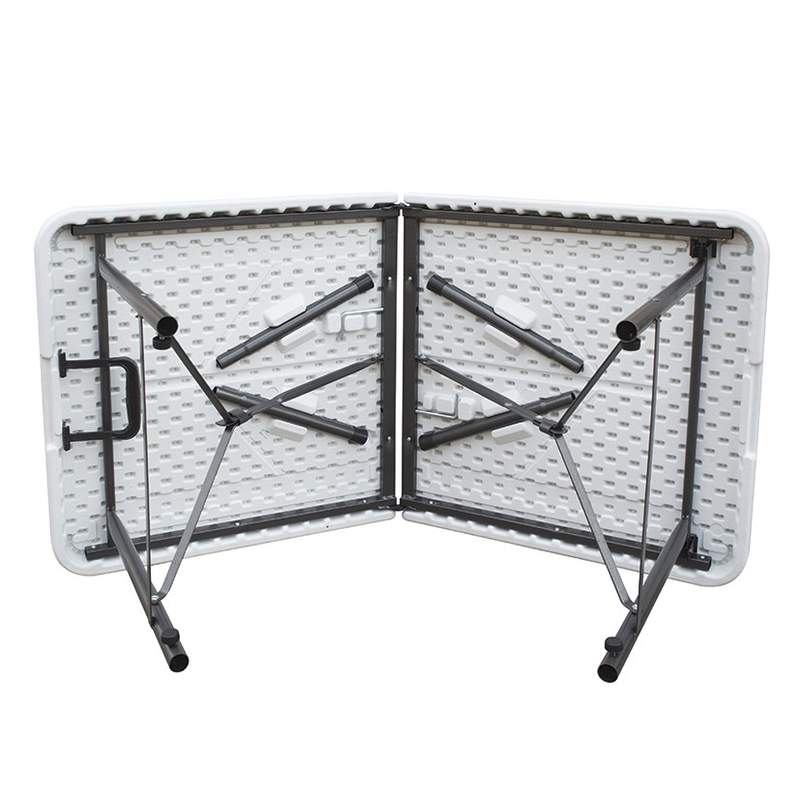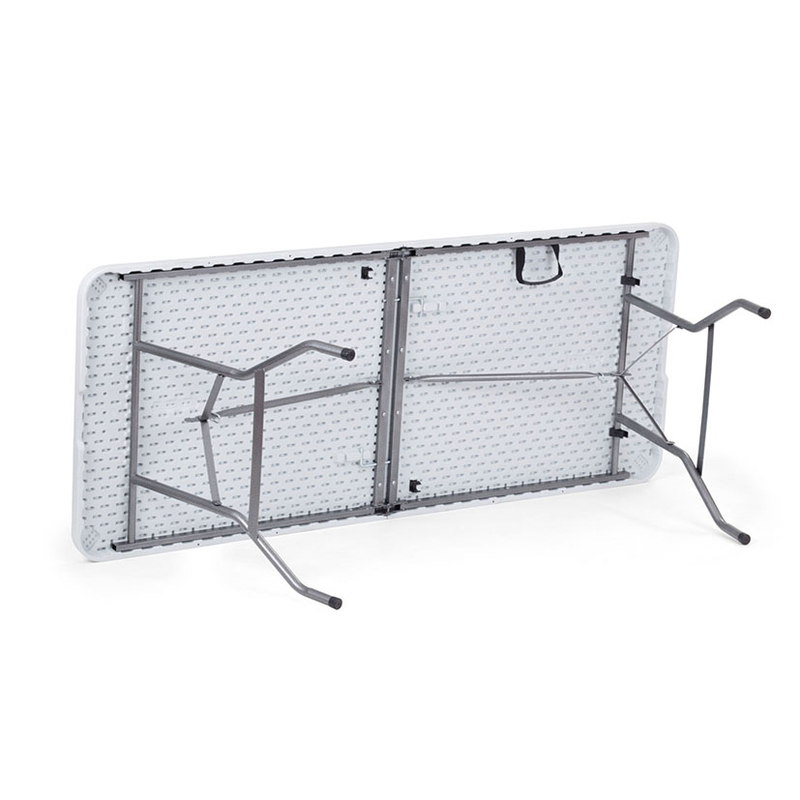 Esta mesa rectangular tiene una estructura de acero que la hace resistente y fuerte. El material de la superficie con el que está fabricado es el polietileno blanco de alta densidad. Esto la convierte en una mesa ideal tanto para exteriores como para interiores. Incorpora un asa para poder ser transportada una vez plegada, ya que dispone de un plegado fácil que reduce su tamaño para poder llevarla de un lugar a otro.