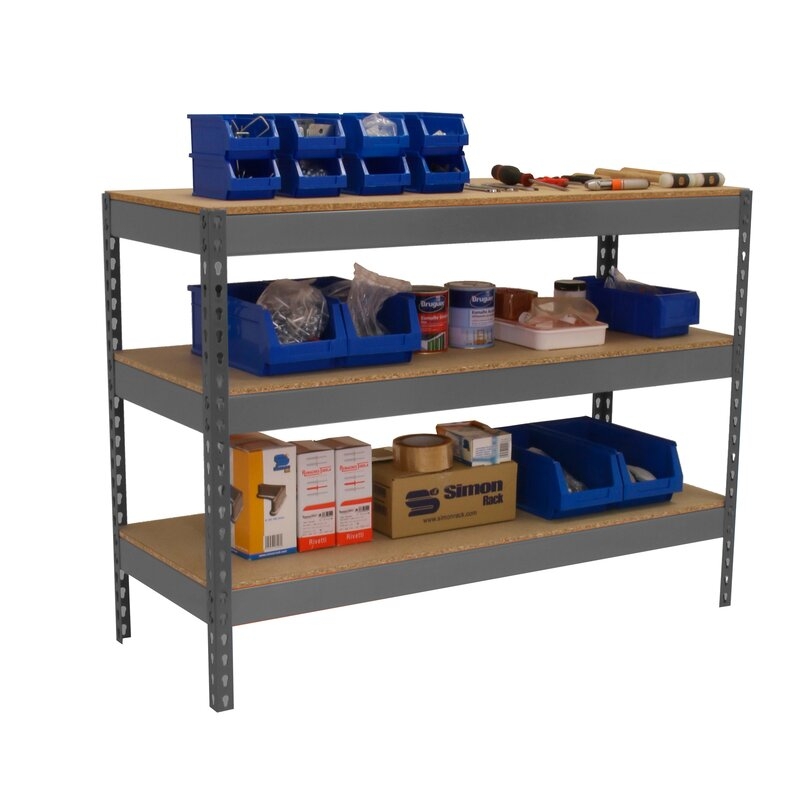 Mesa de trabajo metálica y de montaje sin tornillos de 3 estantes y 900x2100x900mms.