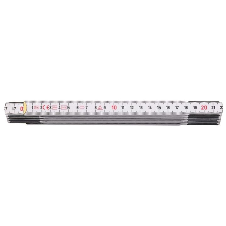 Metro de 10 varillas plegables. Madera escandinava de alta flexibilidad lacada en blanco, números en negro, decenas en rojo.