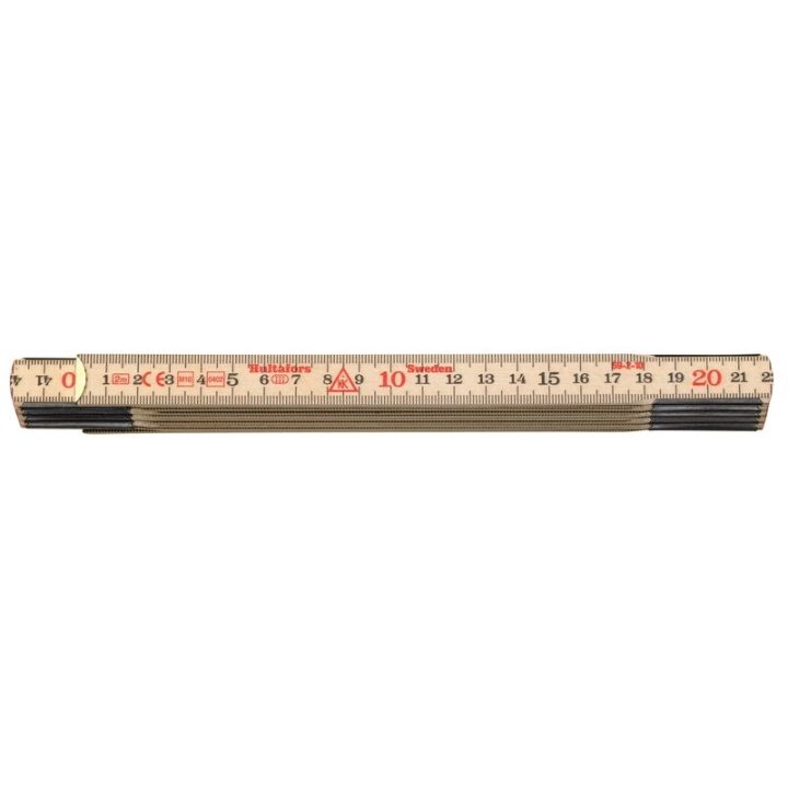 Metro de 10 varillas plegables, fabricado con madera de abedul. Dos capas de laca aplicada antes del montaje para prevenir la humedad y aumentar la resistencia. Números negros, decenas en rojo. Tolerancia según normas CE clase III.