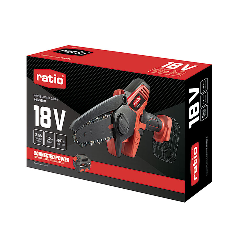 La mini motosierra RATIO RM520-B funciona con el sistema de baterías extraíble e intercambiable Connected Power. Es ideal para trabajar cómodamente y de forma segura cortando arbustos, matas, ramas hasta un máximo de 10 cm. Dispone de mango ergonómico antideslizante para un manejo cómodo de la máquina. Tiene un gatillo con bloqueo de seguridad y otro con velocidad regulable mediante su presión. Te resultará increíblemente práctica, gracias a que no la tienes que conectar a la corriente para su funcionamiento y ofreciéndote una libertad de movimientos. Se presenta en una caja y tiene 3 años de garantía.