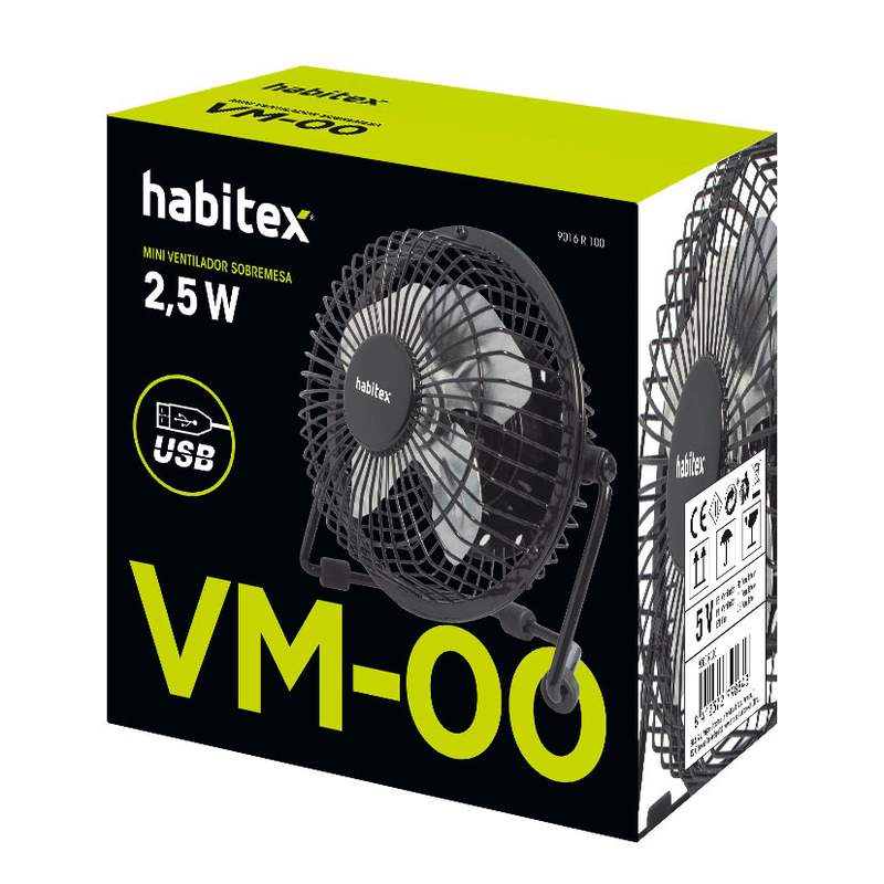 El mini ventilador de mesa HABITEX VM-00 es una opción compacta y elegante para la ventilación personal. Equipado con un motor sin escobillas de cobre conocido por su eficiencia y menor mantenimiento en comparación con los motores con escobillas tradicionales. Este tipo de motor también suele ser más silencioso y duradero. La potencia del ventilador es de 2,5 W, suficiente para generar una brisa refrescante en un espacio reducido sin consumir mucha energía. El ventilador cuenta con un cuerpo metálico, lo que le proporciona durabilidad y una apariencia moderna y robusta. La hélice también es metálica y tiene 4 aspas, diseñadas para ofrecer un flujo de aire constante y eficiente. Este modelo tiene una sola velocidad, proporcionando un flujo de aire sencillo y directo, ideal para usos específicos y constantes.