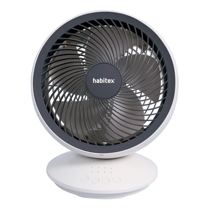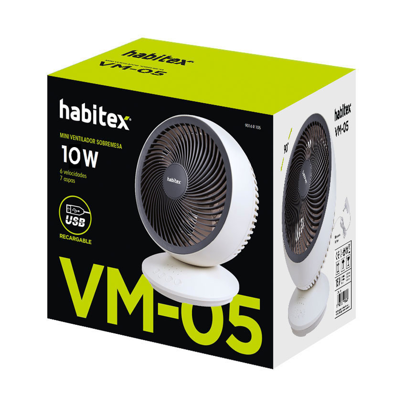 El mini ventilador de mesa HABITEX VM-05 funciona con batería de litio y se carga a través del alimentador suministrado junto al aparato. Tiempo de carga: 5 horas. Tiempo de funcionamiento de 3 5 a 16 horas. Tiene 3 velocidades, cabezal oscilante e inclinable y 5 aspas. Es una solución práctica para mantenerte fresco en espacios pequeños. Su diseño compacto lo hace ideal para colocarlo en tu escritorio, mesita de noche o cualquier superficie plana.