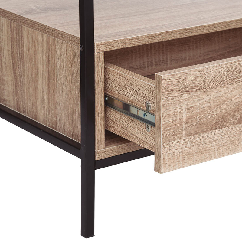 Este mueble combina su estructura de acero pintado en negro con madera MDF efecto roble natural. Presenta un diseño moderno y sencillo. Dispone de 2 cajones (carga máx. 5 kg) frontales inferiores con una apertura de uña una balda inferior para colocar algun dispositivo electrónico y una balda superior donde puedes colocar la televisión cómodamente. Puedes complementar la decoración con la mesa auxiliar y la estantería de la misma gama que tenemos en nuestra web. Viene presentada en una caja desmontada.