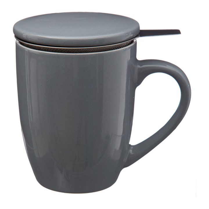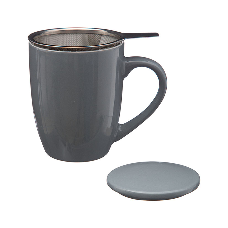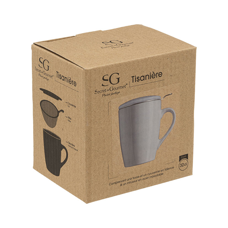 El cuerpo de la taza y la tapa están hechos en cerámica. El filtro está hecho en acero inoxidable y se puede utilizar tanto con hojas como con bolsas de té. La tapa retiene el aroma del té y te sirve de salvamanteles. Se presenta en una caja y tiene unas medidas de 12×8,5xh.11 cm.