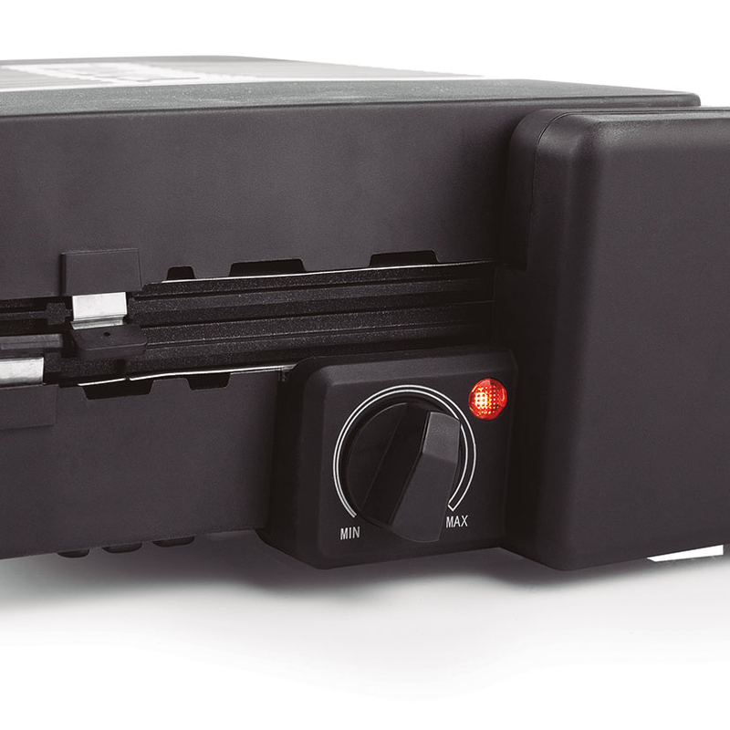 Podrás cocinar cada día una comida más sana y saludable sin usar aceite. Gracias a su potencia de 1.500 W, permite un rápido calentamiento y una temperatura constante de asado. Es muy fácil de usar y muy práctico, sólo debes regular la temperatura mediante su termostato en función del alimento que quieras cocinar en todo momento. Incorpora 2 placas antiadherentes para evitar que se peguen los alimentos y una apetura de 180º. La tapa es basculante fabricada en acero inoxidable. Tiene una superficie total de cocción de 31,5 x 21,5 cm e incorpora un recogegrasas extraíble. Gracias a su piloto podrás saber en todo momento, cuando está lista para poder empezar a cocinar. La puedes guardar en cualquier armario en posición vertical. Tiene 3 años de garantía y se presenta en una caja.