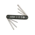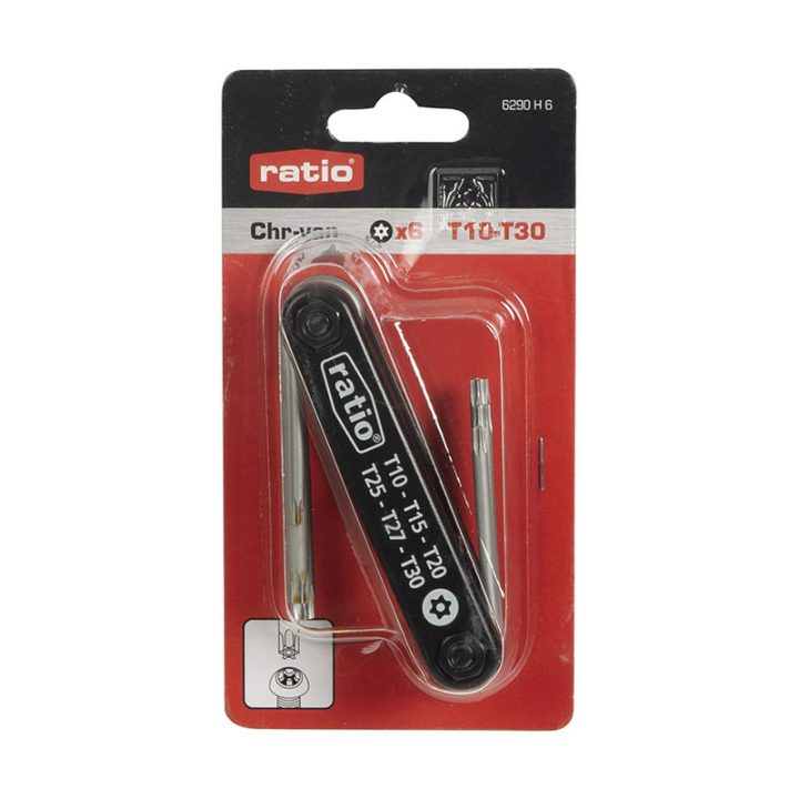 A diferencia de las llaves Allen, las llaves Torx cuentan con una barra circular en lugar de hexagonal y extremos en forma de estrella de seis puntas. Por su diseño, los tornillos de cabeza Torx resisten muy bien el efecto cam-out, es decir, que la varilla del destornillador resbale o se deslice indeseadamente del tornillo. Este juego de navaja plegable de 6 llaves Torx Seguridad, de cromo-vanadio y diferentes medidas (T10-15-20-25-27-30), destaca por su resistencia, durabilidad y la facilidad que proporciona para llevar tus llaves de un lugar a otro, evitando extravíos. Se presenta en un blíster.