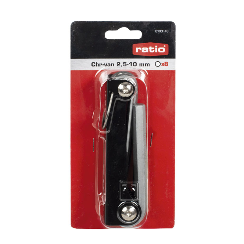 En tu caja de herramientas nunca deberían faltar las llaves Allen, fundamentalmente por sus infinitas aplicaciones. Este juego de navaja plegable de 8 llaves RATIO de acero cromo-vanadio y diferentes medidas (2,5-3-4-5-6-7-8-10 mm), destaca por su resistencia, durabilidad y la facilidad que proporciona para llevar tus llaves de un lugar a otro, evitando extravíos. Se presenta en un blíster.