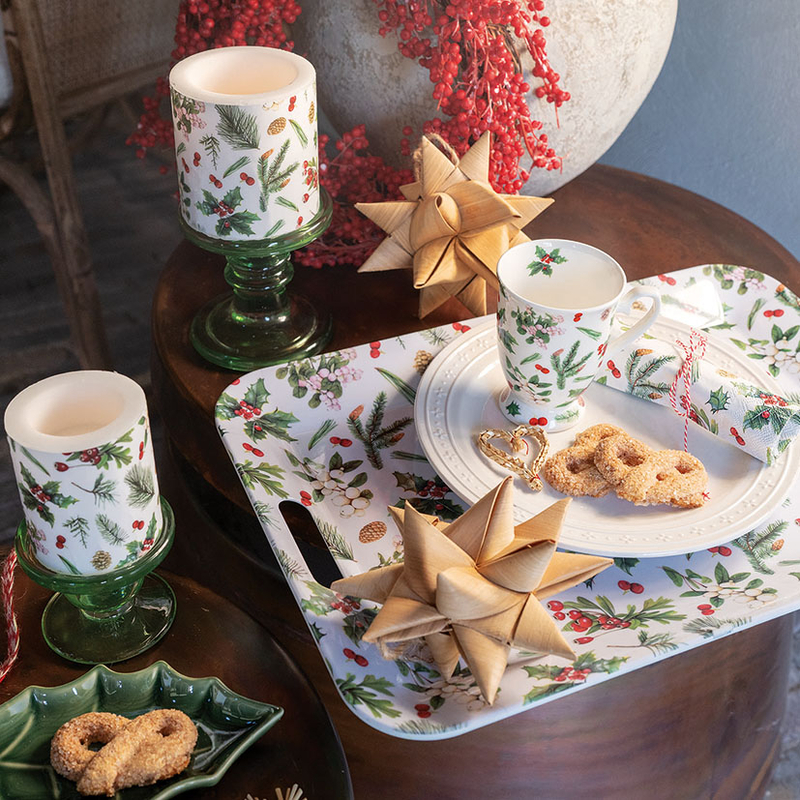 Este pack de servilletas está decorado con plantas y frutos típicos de la Navidad. Tiene unas dimensiones de 33×33 cm. Puedes combinarlo con más productos de la misma serie.