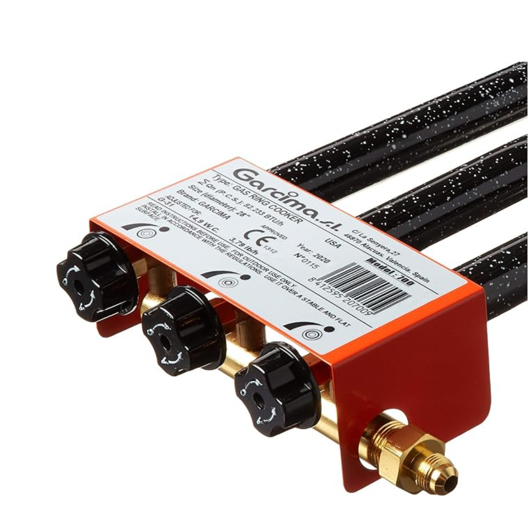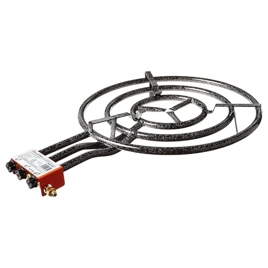 Paellero a gas Garcima de 70 cm, con 3 aros para cocinar con paelleras. Fácil de usar y práctico, ideal para uso exterior con gas butano o propano.