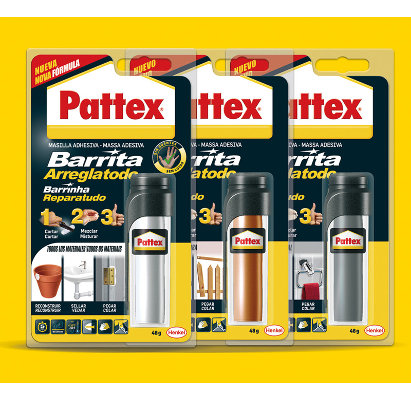 «Pattex Barrita Arreglatodo es una masilla bicomponente de color blanco extra fuerte que restaura, reconstruye, sella, pega, rellena y arregla todos los objetos del hogar.
