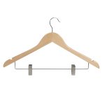 Las perchas están hechas de madera con muescas e incorporan una barra metálica y pinzas para que puedas colgar pantalones y faldas. Se presentan 3 unidades.