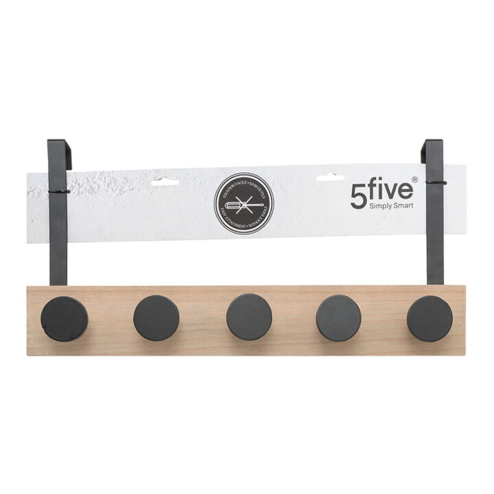 Esta percha de puerta está fabricada en madera MDF de pino y dispone de 5 pomos metálicos en color negro para que puedas colocar tus accesorios y tenerlos a mano.