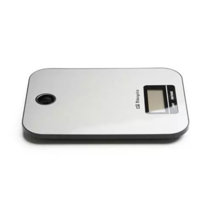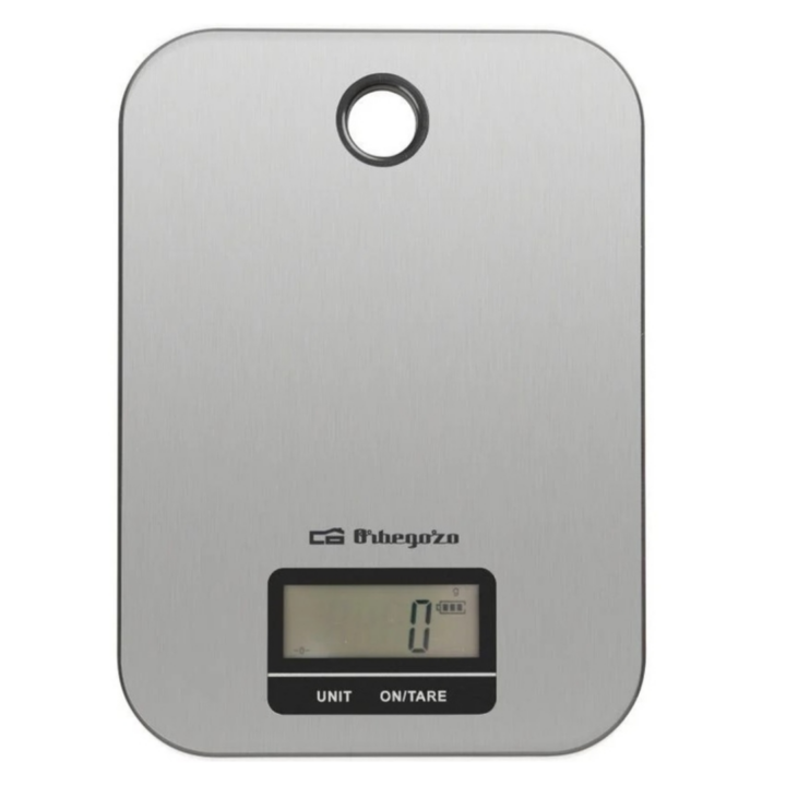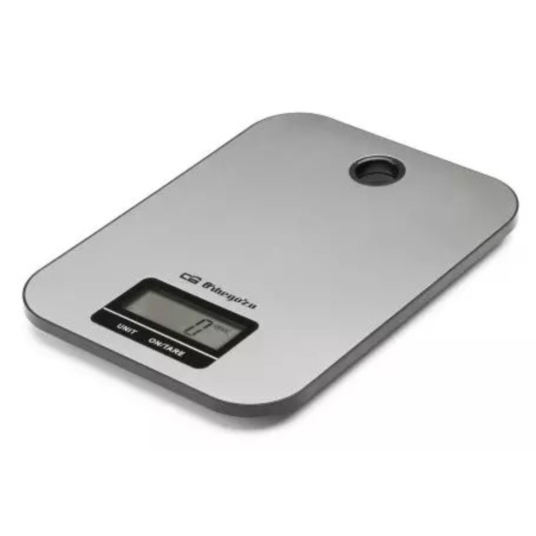 Báscula Orbegozo hasta 5 kg con superficie de acero inoxidable, pantalla LCD grande y función tara.