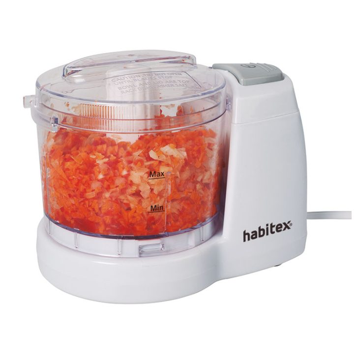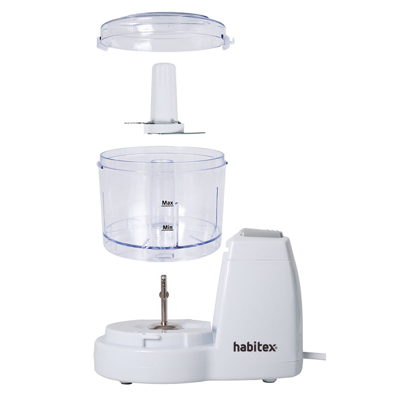 La picadora HABITEX Grind tiene una potencia de 150 W. Está equipada con 2 cuchillas extraíbles en de acero inoxidable, bol de plástico de 375 ml, tapa desmontable y base antideslizante para que no se mueva mientras se utiliza. La caracasa es de plático y Posee un sistema de seguridad de cierre. Además, gracias a su tapa transparente, es ideal para visualizar los alimentos. Se presenta en una caja y tiene una garantía de 3 años.