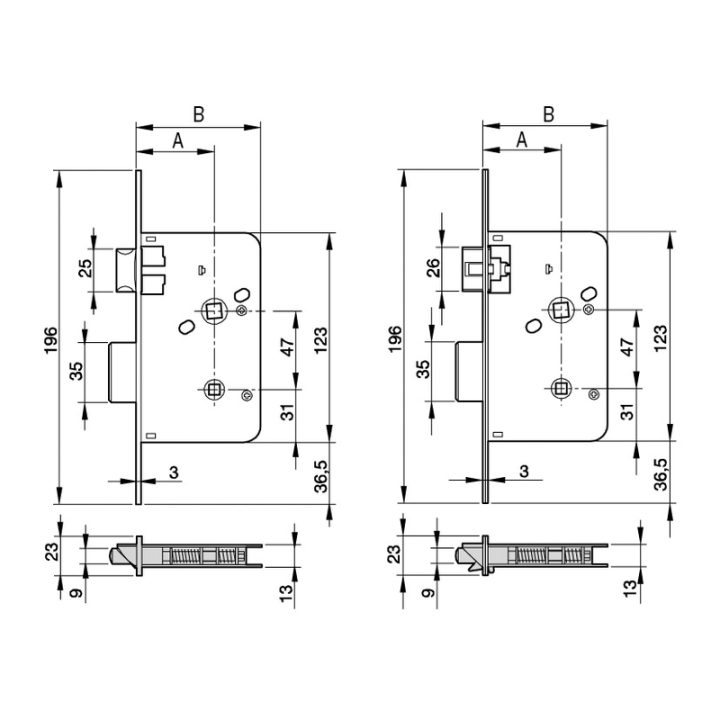 Picaporte para embutir en puerta de madera con golpe y cerrojillo, es reversible. Está disponible en diferentes acabados y se sirve en caja de 2 unidades.