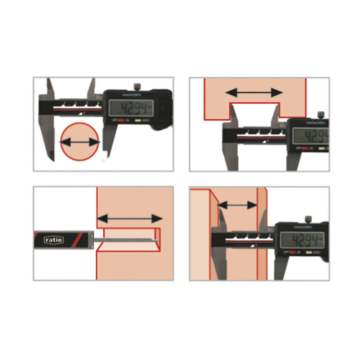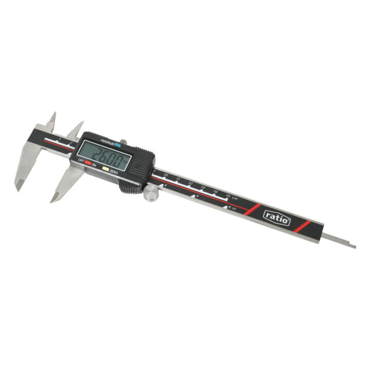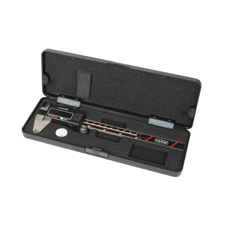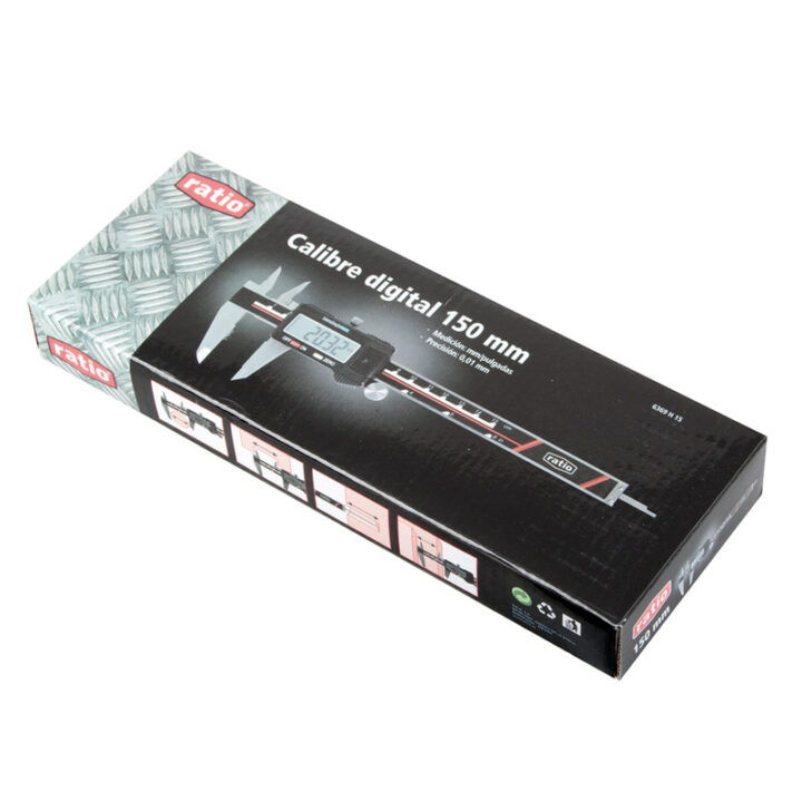 Este modelo digital de RATIO de 150 mm y bocas de 40 mm destaca por su precisión extrema de 0,01 mm. Cuenta con doble medición, en milímetros y pulgadas, y permite efectuar 4 tipos de mediciones: exteriores, interiores, profundidades y alturas. Te permite realizar la medición con el display apagado, de modo que al encenderlo te indicará la medida real de la posición en la que se encuentra el calibre. Se presenta en estuche de plástico protector, incluye 1 pila de botón SR-44 1,5 V + 1 pila de recambio. Norma DIN 862. Se presenta en una caja.