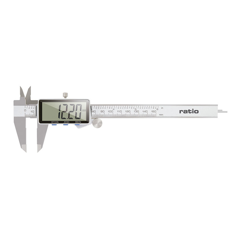 Este modelo digital de RATIO de 150 mm y bocas de 40 mm está fabricado en acero inoxidable endurecido. Destaca por su precisión extrema de 0 01 mm. Cuenta con doble medición, en milímetros y pulgadas, y permite efectuar 4 tipos de mediciones: exteriores, interiores, profundidades y alturas. Se presenta en estuche de plástico protector, incluye 1 pila de botón CR2032 3V. Norma DIN 862. Se presenta en una caja.