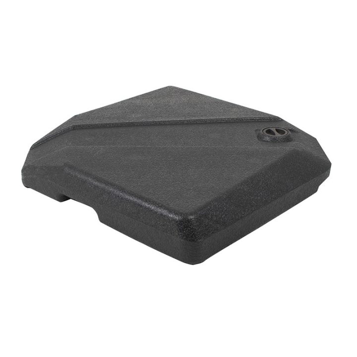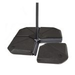 El pie de parasol rellenable de plástico inyectado es una base color gris antracita, fabricada en resina y diseñada para ser llenada con agua o arena. Cuando está lleno de agua, pesa 16 kg, y lleno de arena, pesa 25 kg. Cuenta con alta resistencia a los rayos UV y sus dimensiones son 49x49x8,7 cm. Se sirven 4 unidades.