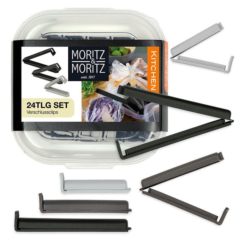 El juego está compuesto por 24 pinzas de 8-6,5 cm, 8-8,5 cm y 8-10,5 cm. Las pinzas vienen en colores surtidos y son aptas para tu nevera y congelador. Viene presentado en un envase transparente de plástico de alta calidad libre de BPA, fácil de limpiar. Apto para el lavavajillas.