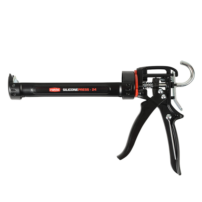 La pistola de silicona Press-24 cuenta con mango giratorio 360º de aluminio y gatillo de metal. Resulta muy adecuada para sellador de alta viscosidad y muy útil para bajas temperaturas. Dispone de paro automático de flujo que evita la pérdida de silicona varilla de punción integrada, así como carro reforzado y remachado. Ofrece una relación de empuje de 24:1 y paso de 5 mm, e incorpora tornillo ajustable para reducir huecos de empuje.