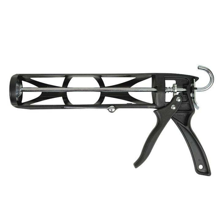 La pistola de silicona Press-7 cuenta con cuerpo y gatillo de nilón + fibra de vidrio, y diseño con gancho para escalera. Dispone de paro automático de flujo que evita la pérdida de silicona, varilla de punción integrada, así como barra de empuje y disco de émbolo con tratamiento térmico. Ofrece una relación de empuje de 7:1 y paso de 12 mm.