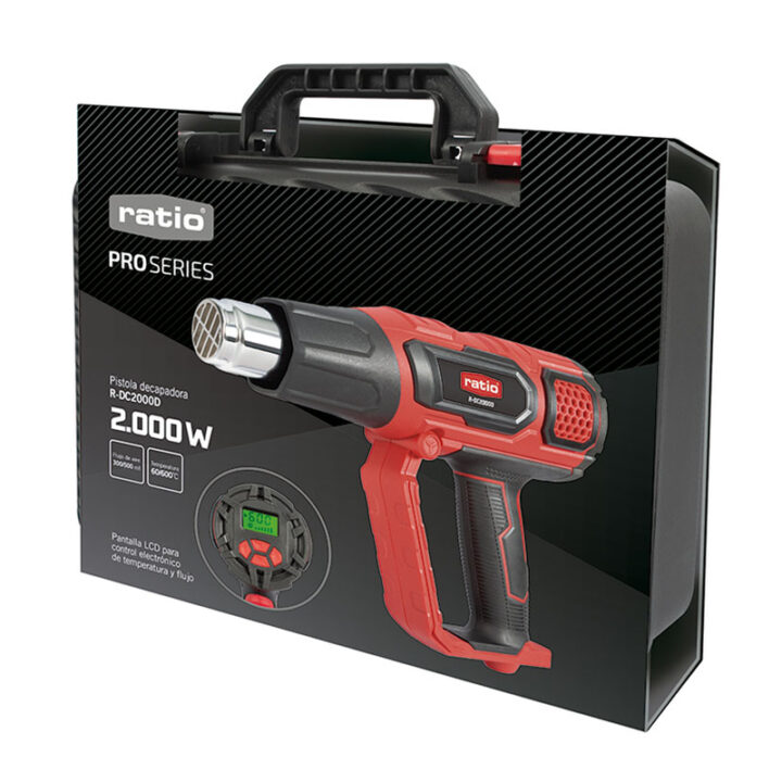 Este modelo de RATIO profesional está equipado por un motor de 2000W con protección contra sobrecalentamiento. Dispone de control digital con pantalla LCD para ajustar una de las 2 temperaturas y el flujo de aire una protección contra sobrecalentamiento. Empuñadura bimaterial para un cómodo manejo de la herramienta. Incluye maletín de transporte con 5 accesorios. Viene presentado en una caja.