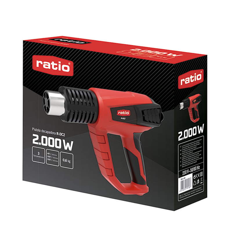 La pistola decapadora, también conocida como pistola de calor, cuenta con múltiples aplicaciones y usos. Puedes utilizarla para decapar muebles, pero también para retirar adhesivos, descongelar tuberías al aire libre, unir artículos o piezas de plástico, secar superficies, etc. Este modelo de RATIO destaca por disponer de 3 temperaturas, El nivel 1, ajuste de aire frío, es el idóneo para enfriar una pieza calentada previamente o para secar pintura. También es idóneo para enfriar la máquina antes de devolverla a su maletín o antes de cambiar las boquillas. El nivel 2 es el adecuado para doblar y soldar plásticos. El nivel 3 es idóneo para retirar pintura o para descongelar tuberías. Incluye 5 accesorios: Gancho para raspar, boquilla concentrador, boquilla plana, boquilla curva y boquilla con protección para vidrio. Se presenta en una caja.