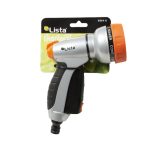 Se trata de una pistola para regar que gracias al sistema de bloqueo con función de fijación, te permite mantener un caudal constante de agua sin que tengas que presionar continuamente el gatillo. Incluye una válvula de control del caudal de agua que puedes manejar con sólo una mano dependiendo de tus necesidades. La pistola dispone de siete tipos de chorros, por eso esta pistola LISTA Ergometal es ideal tanto para tareas de limpieza como para tareas de riego. Viene presentada en blíster.