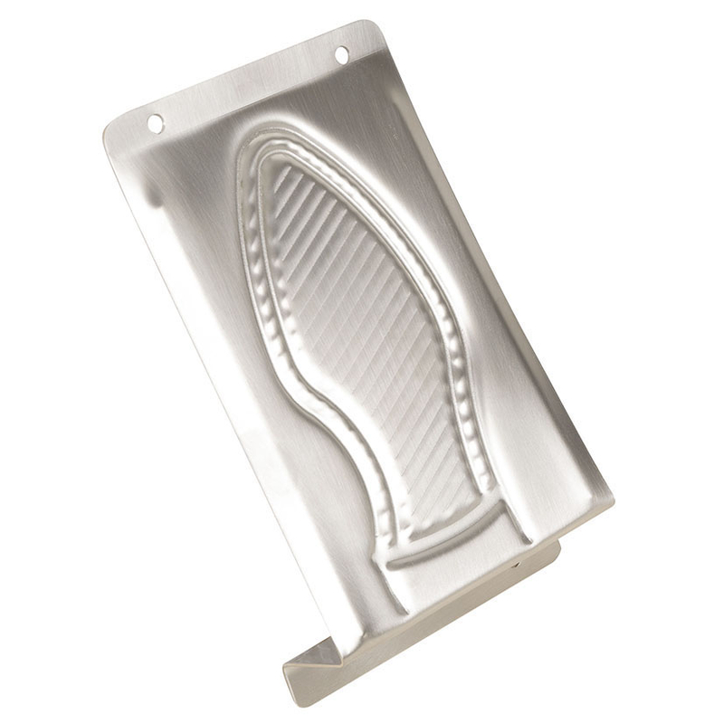 Este tope para puerta Lleva impresa una huella de zapato. Acabado acero inoxidable. Tiene unas medidas de 148x98x2,50 mm