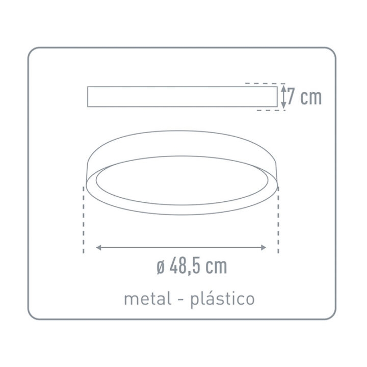 Plafón con LED integrado de estructura en acero y plástico. Sus 24W de potencia emiten un flujo luminoso de 2.500 Lumen a una temperatura de 2700-6500K regulables con el mando a distancia que viene incluido. Las medidas del plafón son 48 5xh.7cm. 25.000 horas de vida útil. Se presenta en una caja. No apto para reguladores externos.