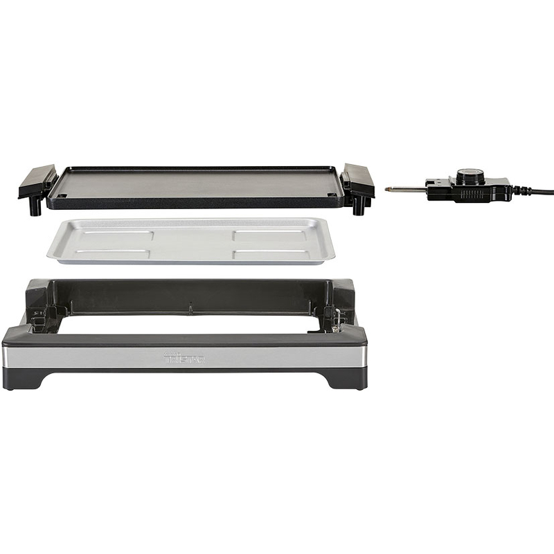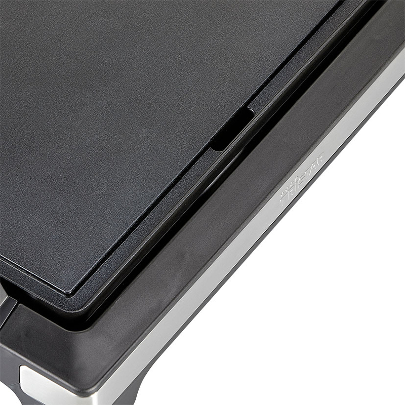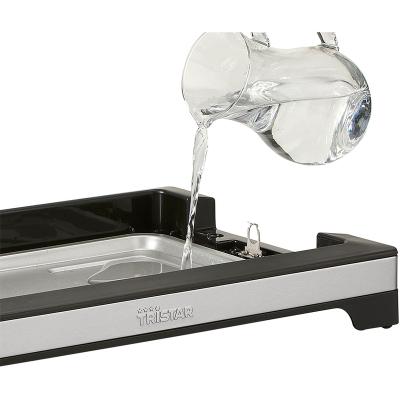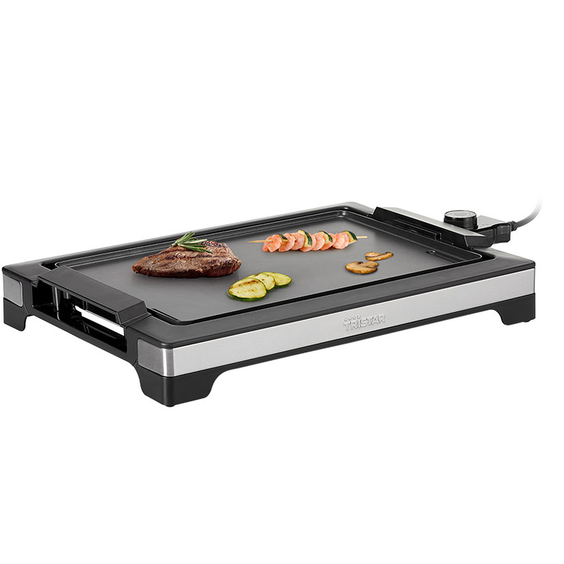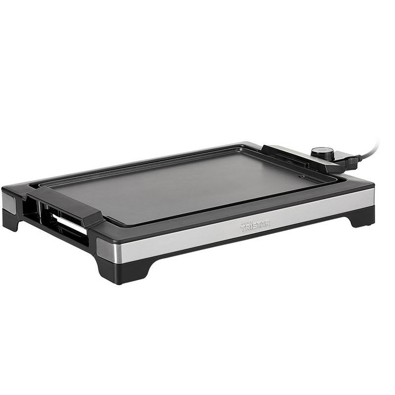 La plancha de asar TRISTAR BP-2781 Tiene una potencia de 2.000 W que podrás controlar mediante su termostato y regular la temperatura en función del alimento que quieras cocinar en todo momento. Cuenta con recubrimiento antiadherente, hace que los alimentos no se peguen nunca y que la plancha sea muy fácil de limpiar. La superficie de la plancha tiene tamaño37x25 cm para cocinar de forma sana sin utilizar aceite. Una vez esté lista y en su punto, podrás llevarla directamente a la mesa y servir los alimentos directamente. Asas de toque frío y bandeja recoge-grasas. Tiene 3 años de garantía y se presenta en una caja.
