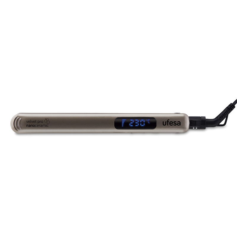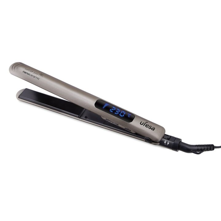 La plancha de cabello UFESA PP5500 tiene las placas extralargas y recubiertas de nano cerámica profesional. Dispone de un diseño ergonómico y estilizado para un cómodo manejo. Además, podrás alisar y rizar tu melena gracias a sus placas basculantes con función iónica, aportando un mayor brillo y protección. Son de calentamiento rápido (-30 seg), podrás regular la temperatura digitalmente desde 150-230ºC. Incorpora un dislplay, bloqueo de cierre para evitar que las placas se dañen y poder guardarlas fácilmente. Además dispone de cable rotativo 360º y funda termoprotectora. Se presenta en una caja y tiene 3 años de garantía. Puedes consultar el video del proveedor que tenemos colgado en nuestra web.