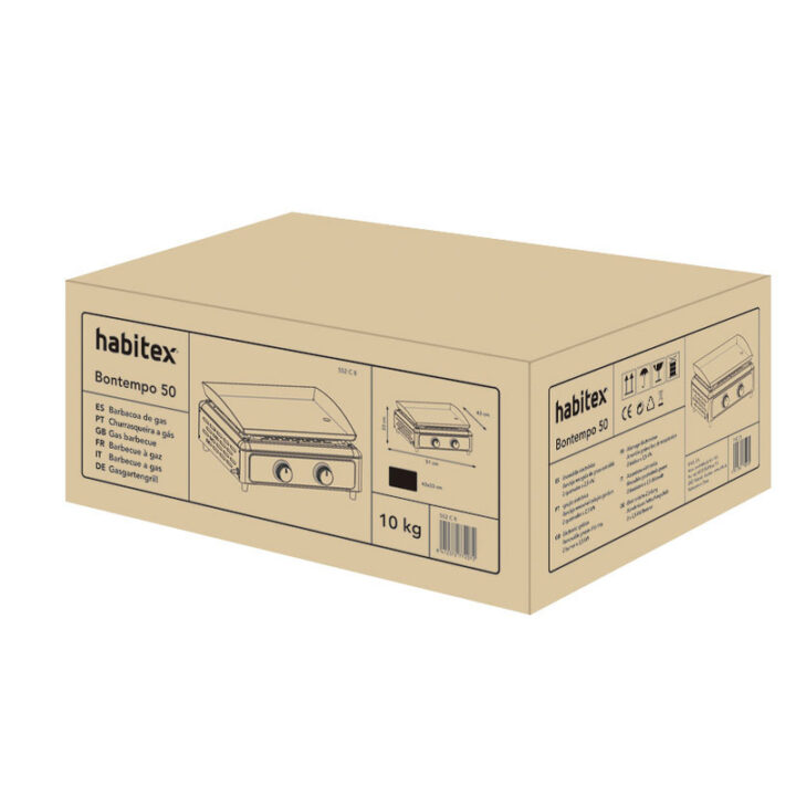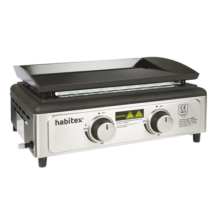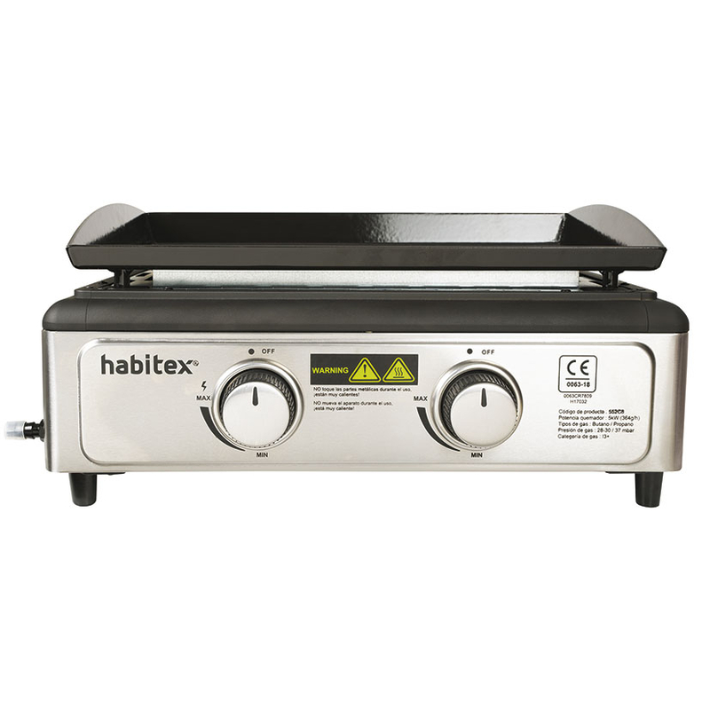 Esta plancha está fabricada en acero esmaltado y su estructura es metálica. Está equipada con un sistema de encendido electrónico 2 quemadores de 2,5 kW y una bandeja extraible de recogida de grasa. Las dimensiones de la plancha son 51x43xh.23 cm. Viene presentada en caja. Tiene una garantía de 3 años.