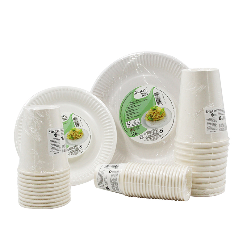 Estos platos están fabricados en cartón FSC eco blanco, indicado para uso alimentario. Se presentan en una caja display que contiene 15 packs de 10 platos.