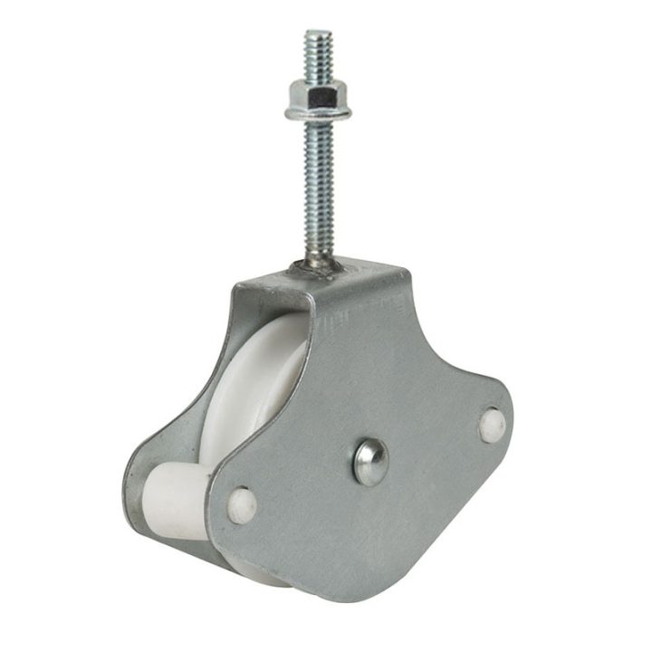 Polea con rueda de plástico de 40 mm de diámetro y guarda. Se presenta en cajas de 25 unidades.