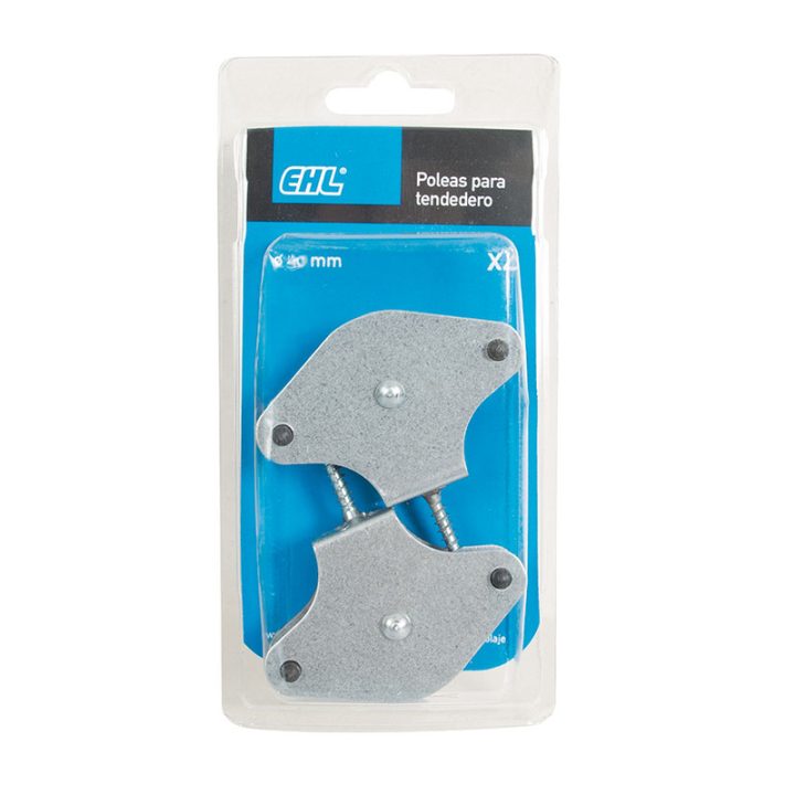 Polea con rueda metálica de 40 mm de diámetro y guarda. Se presenta en un doble blíster de 2 unidades.