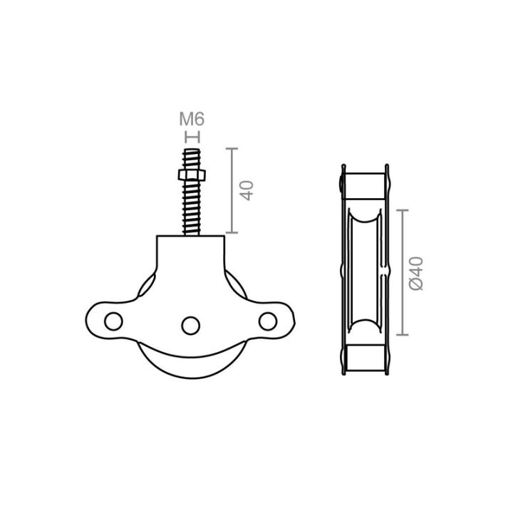 Polea con tuerca metálica de 40 mm de diámetro fabricada en zamak con acabado cincado y cuerpo en acero. M6