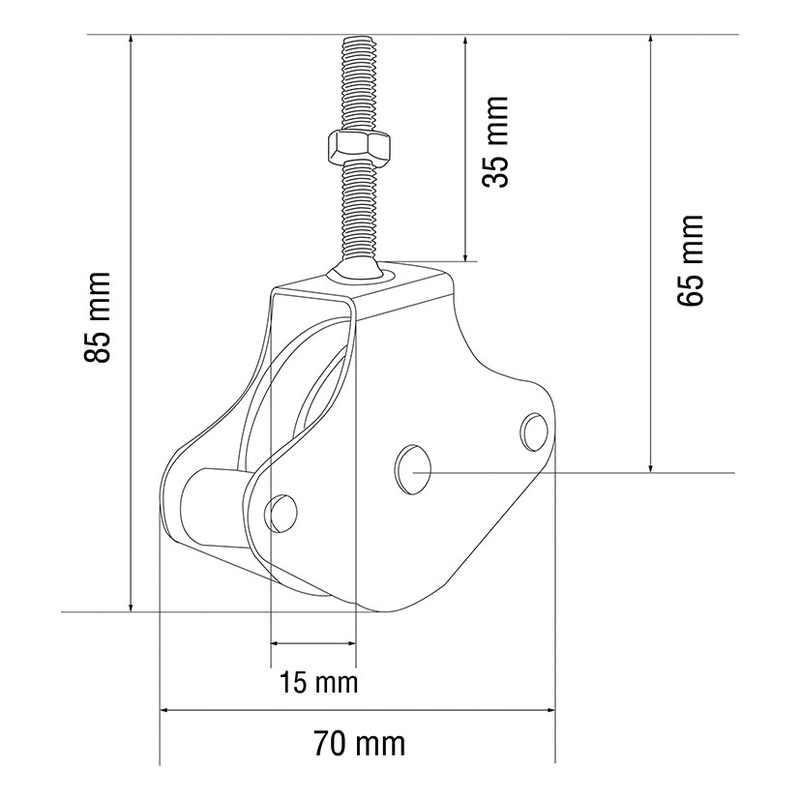 Fácil de instalar. Gracias a esta polea se multiplica la fuerza con la que se tracciona. Contiene espiga con tuerca.