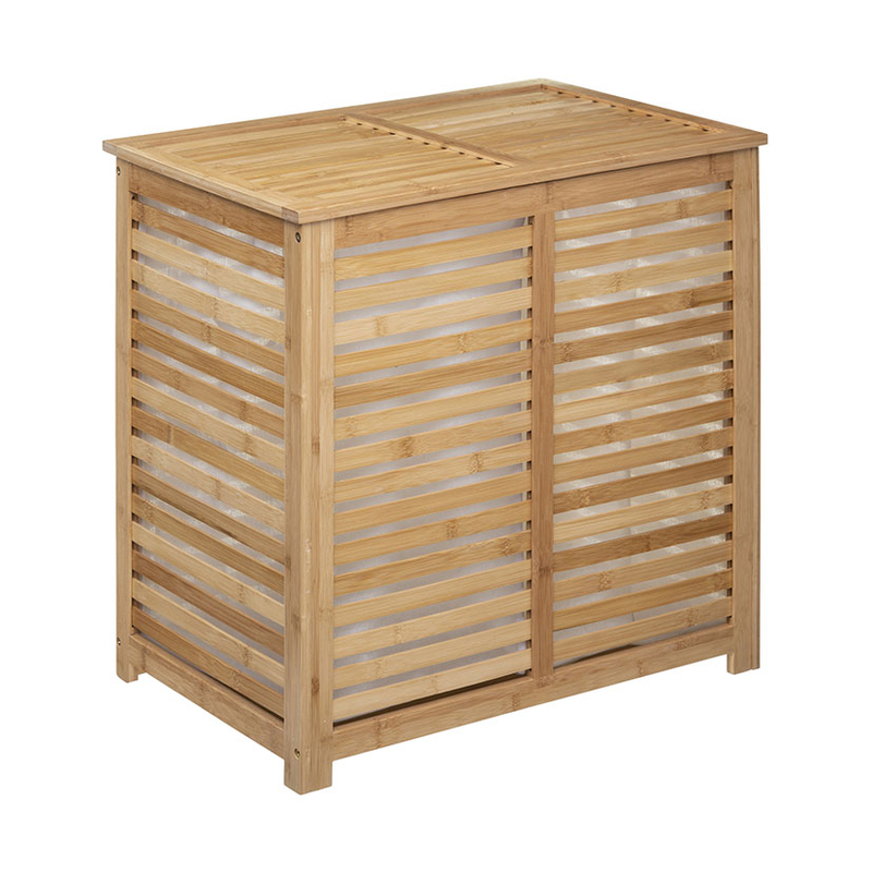 Esta cesta pongotodo está fabricado en bambú, incorpora una tela en su interior en color blanco y tapa doble. Los tonos de la madera y el blanco, hacen de este complemento una combinación agradable en tonos cálidos para nuestro baño u otra habitación, así como una función decorativa. Tiene una capacidad de 100 litros.