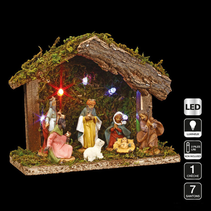 El pesebre es el elemento de la Navidad cristiana algo muy representativo en los hogares españoles. Indica el nacimiento de cristo y los valores que conlleva, la humidad, la protección y la familia. El portal está elaborado en madera e incluye 5 led y 7 figuras representativas del nacimiento del niño Jesús. Funciona con 2 pilas AA (LR06). Viene presentado en una caja.