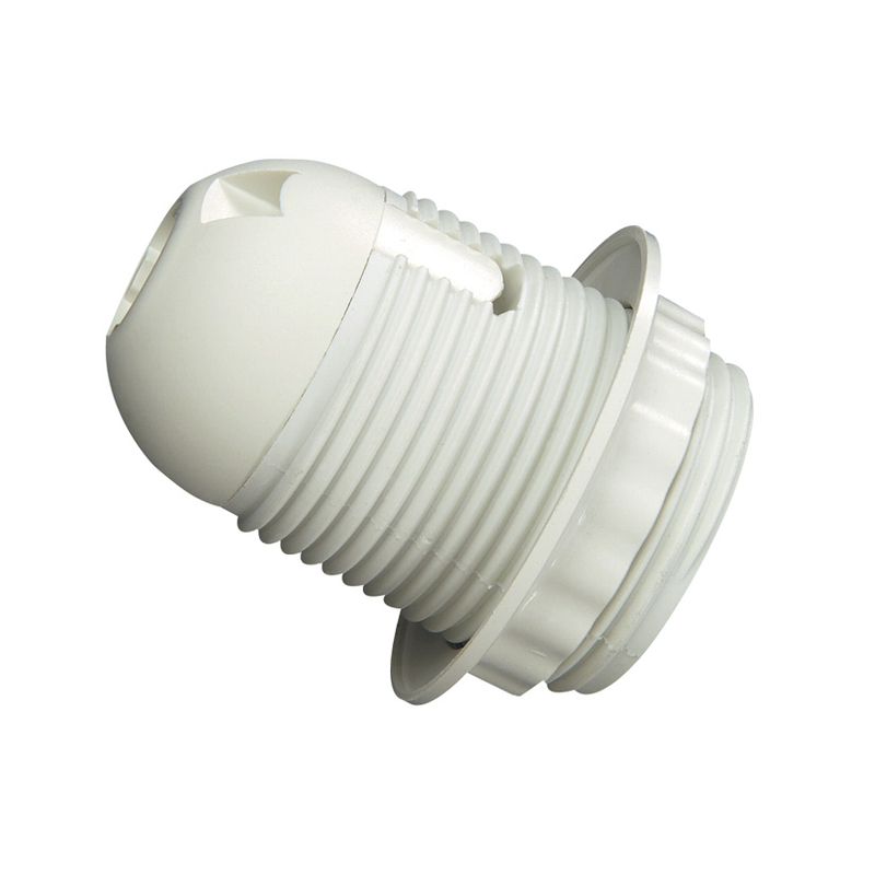 Está fabricado en plástico y es de color blanco. La entrada de rosca E-27 y lleva un tope. Funciona a 4 amperios y 250 voltios. Se presenta en un doble blíster.