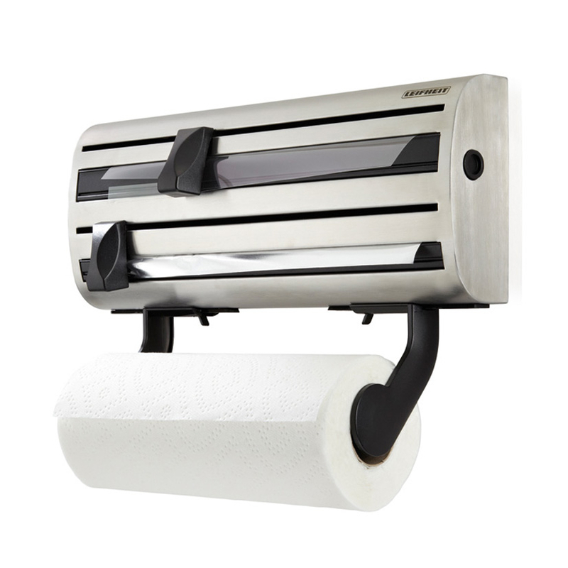 Este utensilio de cocina está fabricado en acero inoxidable 18/10. Gracias a sus cuchillas en acero inoxidable templado y su desplazador ergonómico, podrás cortar el film transparente o el de aluminio fácilmente y con precisión. El portarrollos LEIFHEIT tiene tres compartimentos: para film transparente, aluminio y papel de cocina. Los rollos no están incluidos en este complemento de cocina. Viene presentado en caja.