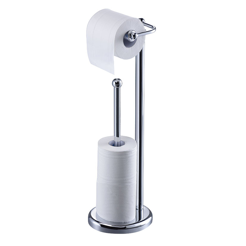 Este portarrollos está fabricado en acero inoxidable y tiene un acabado cromado. De base redonda e incorpora un portarrollos para varios rollos de papel de reserva. Viene presentado en una caja.
