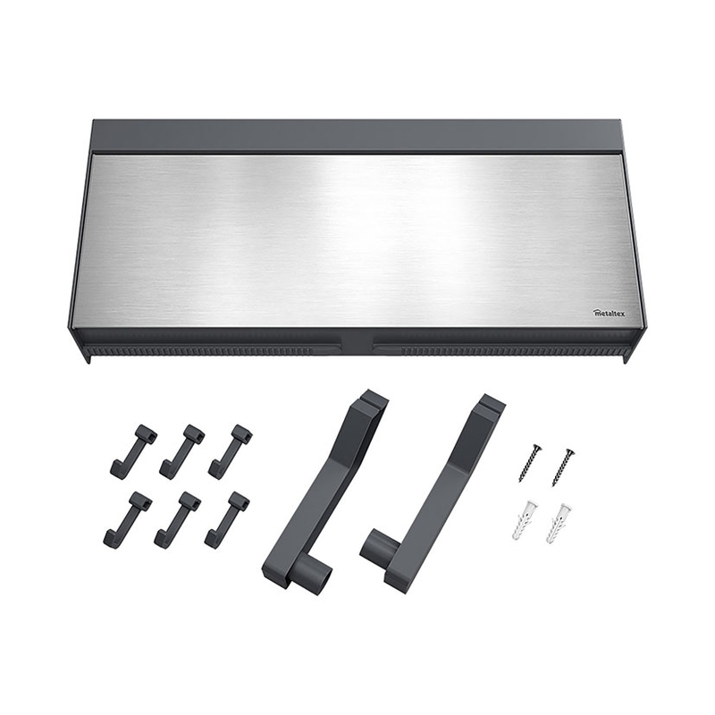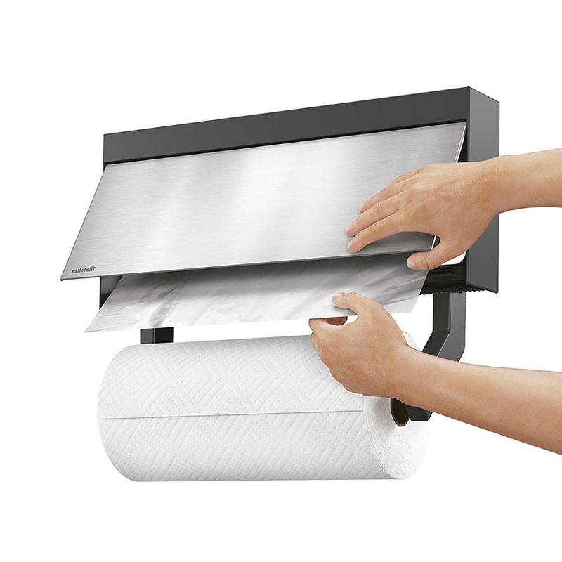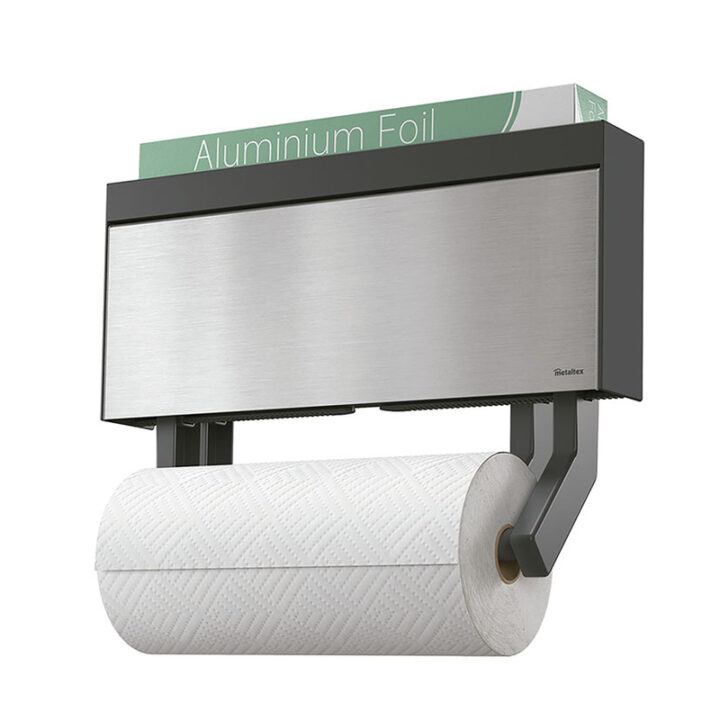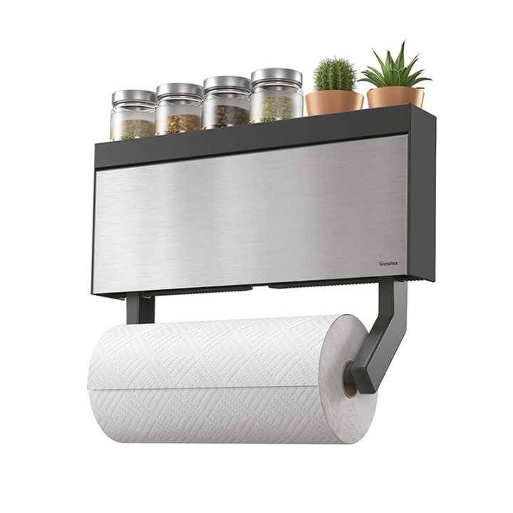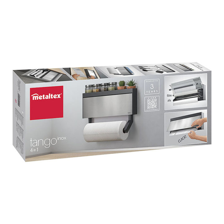 El portarrollos de pared para cocina METALTEX Tango está fabricado en acero inoxidable. Es resistente y duradero proporciona un aspecto elegante y moderno que complementa cualquier cocina. Triple Dispensador: Ideal para tener a mano y organizar eficientemente tu rollo de cocina, film transparente y papel de aluminio. Facilita el corte y dispensado de cada material sin esfuerzo. Elige entre el portarrollos de cocina o el práctico juego de 6 ganchos para colgar tus utensilios de cocina, adaptándose a tus necesidades y preferencias. Repisa Superior: Añade un espacio extra de almacenamiento para pequeños objetos o especias, maximizando la funcionalidad del espacio. Dimensiones Compactas: Con medidas de 36 x 6 x 17 cm, su tamaño compacto permite un fácil montaje sin ocupar demasiado espacio en la pared. Tornillos de Montaje Incluidos: Facilita la instalación, asegurando que tu portarrollos esté firmemente fijado a la pared para un uso seguro y confiable.