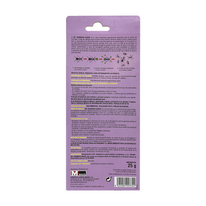 Formula en gel para ser utilizado como cebo en el caso de las hormigas es especialmente eficaz ya que, además de ingerirlo, pueden llevarse resto de cebo en las patas y en el cuerpo contaminando así el resto del hormiguero, y provocando gran mortalidad en soldados, larvas e incluso en la reina. Además, lo puedes utilizar para controlar otros insectos corredores y gracias a su materia activa es eficaz sobre numerosas especies de insectos plagas. Es importante su aplicación puntual cerca del nido o donde veas más cantidad de hormigas u otros insectos.
