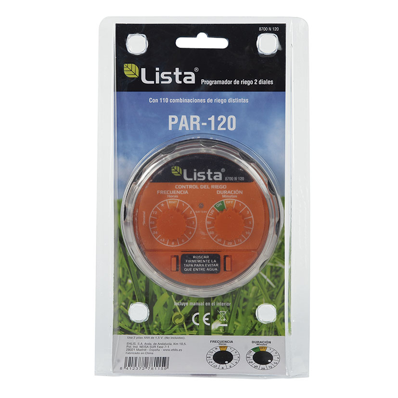 Este programador funciona mediante 2 diales de programación: uno para fijar la frecuencia de riego entre 1 a 72 horas, o una vez a la semana y el otro para fijar la duración de 1 a 120 minutos. Trabaja a una presión de trabajo de 0-6 bares. Dispone de indicador de LED que te indica que la batería está cargando. Incluye una tapa transparente externa para proteger el frontal y necesita 2 pilas AAA que no vienen incluidas. Se presenta en una caja.