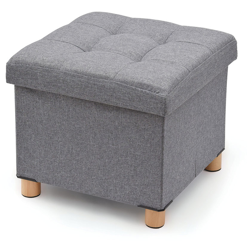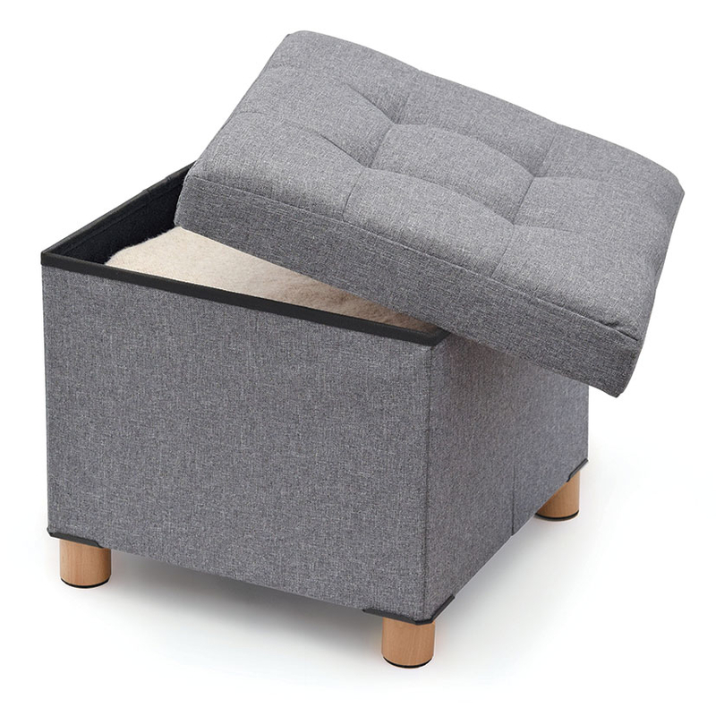 Este puf dispone de 4 patas en madera dura con almohadillas antideslizantes para proteger el suelo. Está fabricado tablero MDF con relleno de espuma y patas de madera. Lo podrás utilizar como un asiento adicional en el salón, o un complemento de almacenamiento para tu dormitorio. De color gris claro y con unas diemnsiones de 38x38xh.40cm. Además, las patas se pueden quitar y se puede plegar fácilmente para su posterior almacenaje.