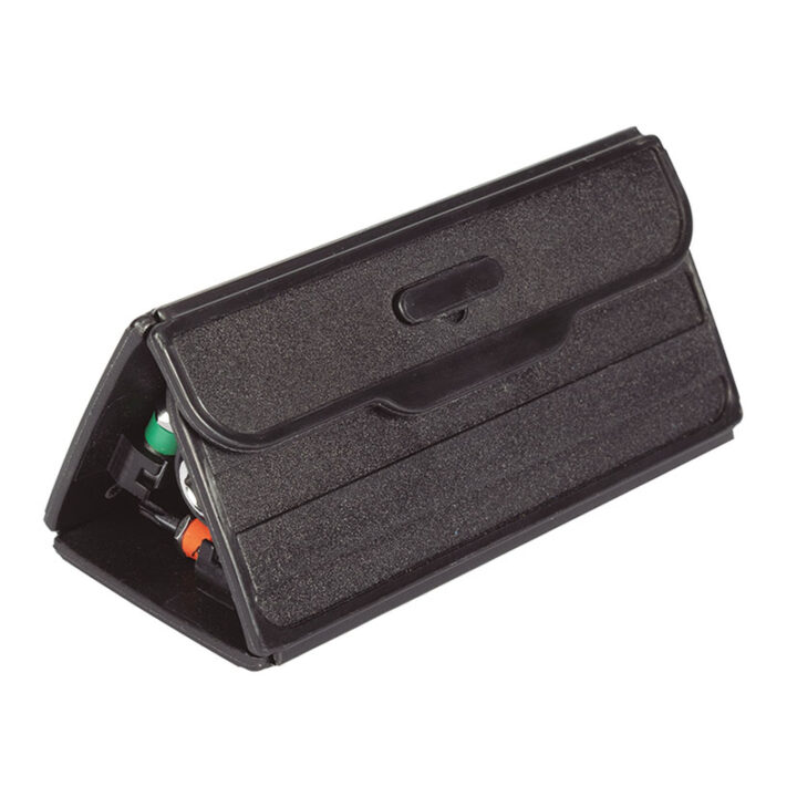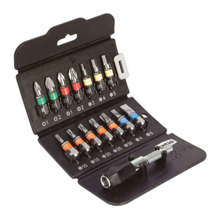 Estuche plegable con 15 accesorios compuesto por puntas de acero S2 con código de color, un adaptador magnético y clip para cinturón.